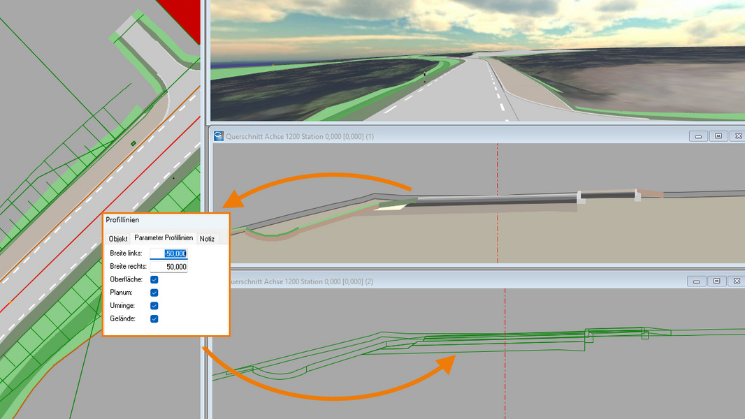 Die klassische, skriptbasierte Querprofilentwicklung lässt sich so problemlos mit dem Neuen Straßenentwurf kombinieren. Anwender können ihre eigenen Profillinien nutzen und gleichzeitig von der automatischen Auswertung profitieren.