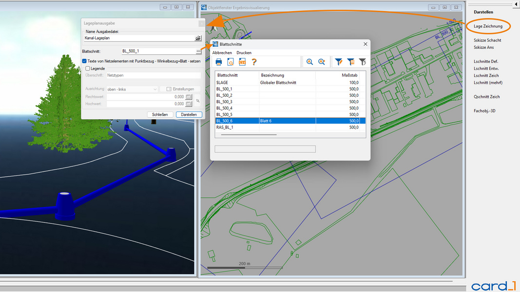 Ein besonders wichtiger Punkt für Planer: Mit der neuen Funktion „Darstellen < Lage Zeichnung“ lässt sich jetzt nicht nur der globale Blattschnitt $LAGE nutzen, sondern jeder beliebige Blattschnitt auswählen. Das sorgt insgesamt für eine konsistente, fachlich korrekte Ausgabe – egal welcher Blattschnitt gewählt wird.
